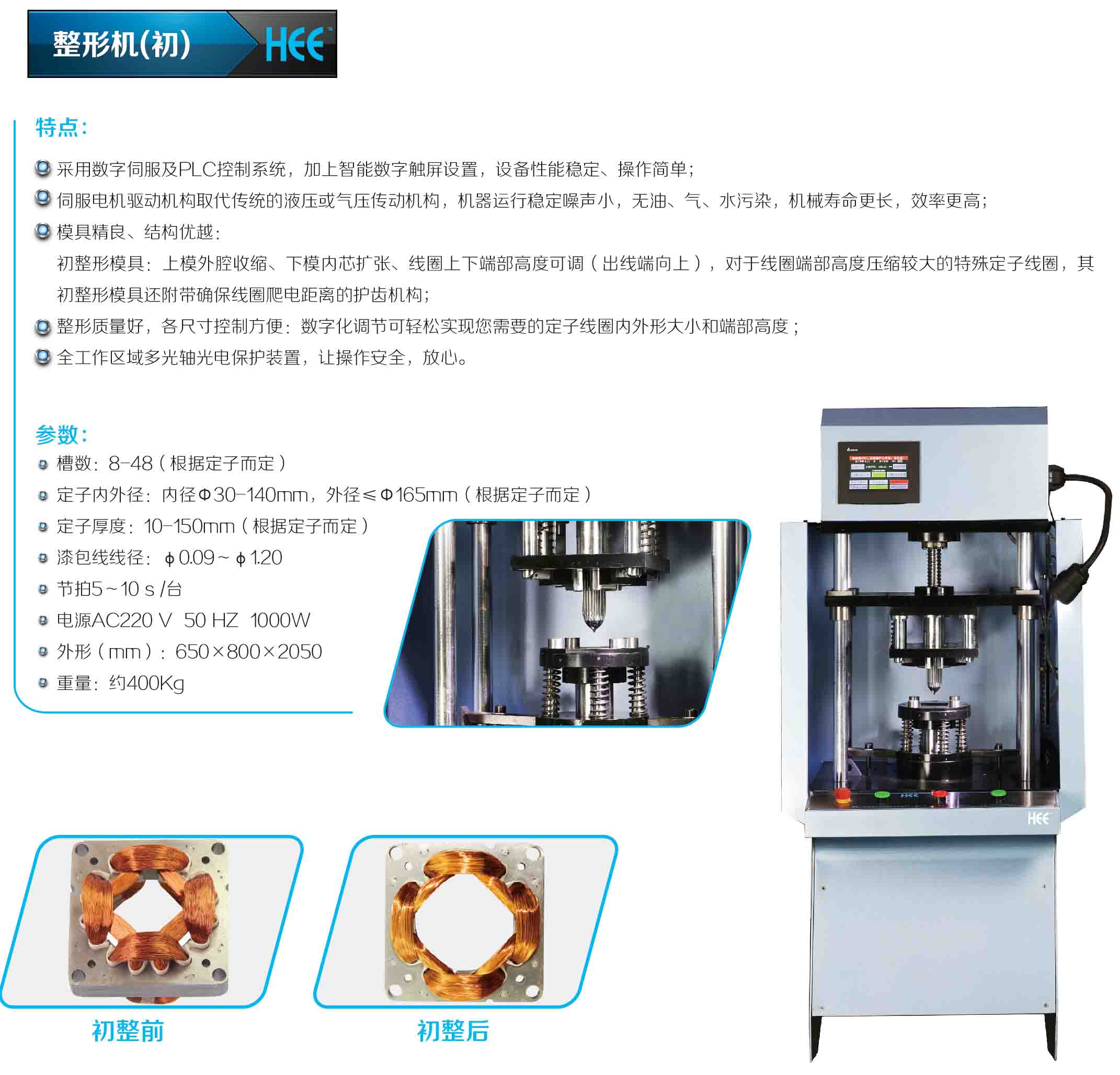 華源電機(jī)設(shè)備有限公司最新發(fā)行的定子初整型機(jī)內(nèi)張型,與傳統(tǒng)的直筒初整型機(jī)的不同在于定子不單有調(diào)整嵌線后上下線組長(zhǎng)度,更通過內(nèi)張的設(shè)計(jì)原理達(dá)到整型闊張的整型效果,為后續(xù)工序更加簡(jiǎn)便和整型效果更好。該機(jī)采用數(shù)字伺服及PLC控制系統(tǒng)智能控制,可對(duì)0.10-----1.20mm嵌好的漆包線定子經(jīng)過整型之后,輕易安裝挑型和綁線。操作簡(jiǎn)單,性能穩(wěn)定,效率高;其特點(diǎn)在于: