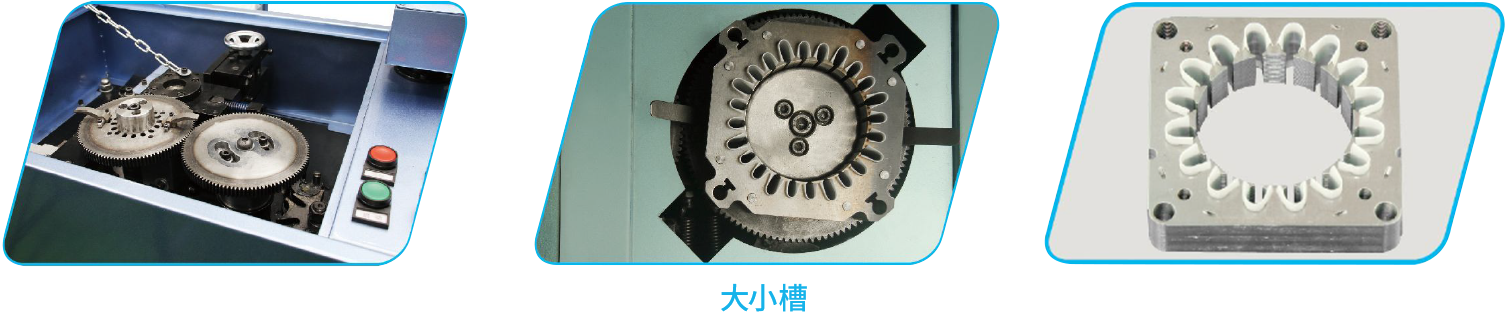 大小槽定子生產(chǎn),僅需一機(jī)一模單次加工,遠(yuǎn)優(yōu)于一機(jī)雙?;螂p機(jī)雙模分兩次加工模式2;
